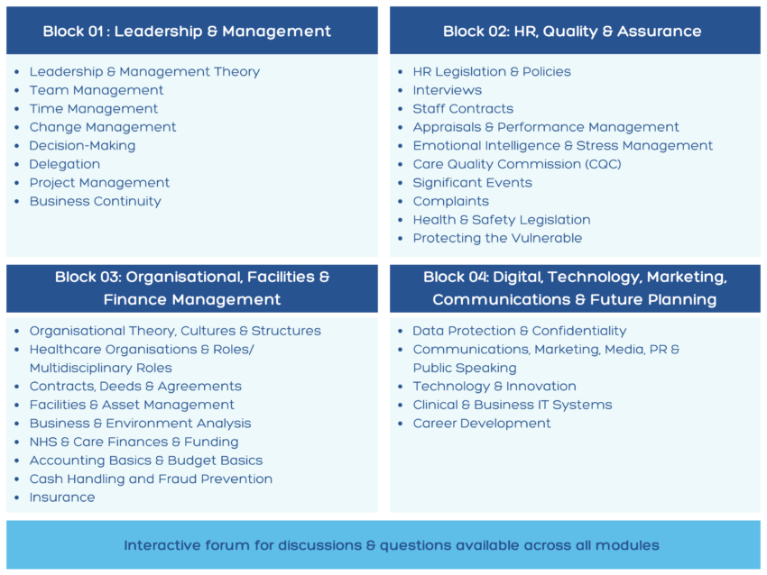 Each of the four module blocks include a range of topics to work through flexibly over the allocated three months per block. Each module includes activities and knowledge checks to support you.